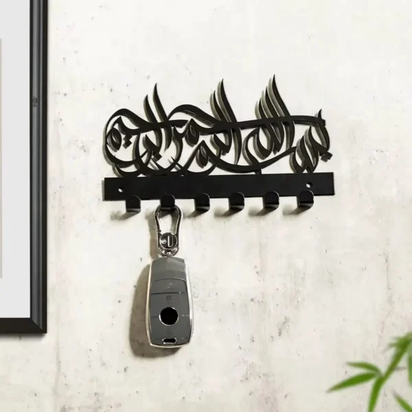 Elevate your home with the Barakah Calligraphy Key Holder, a beautifully crafted wall-mounted organiser featuring intricate Arabic calligraphy. Designed with multiple hooks, this elegant piece blends functionality with Islamic art, making it a perfect addition to any entryway or office space. Ideal for holding keys, accessories, or small essentials.